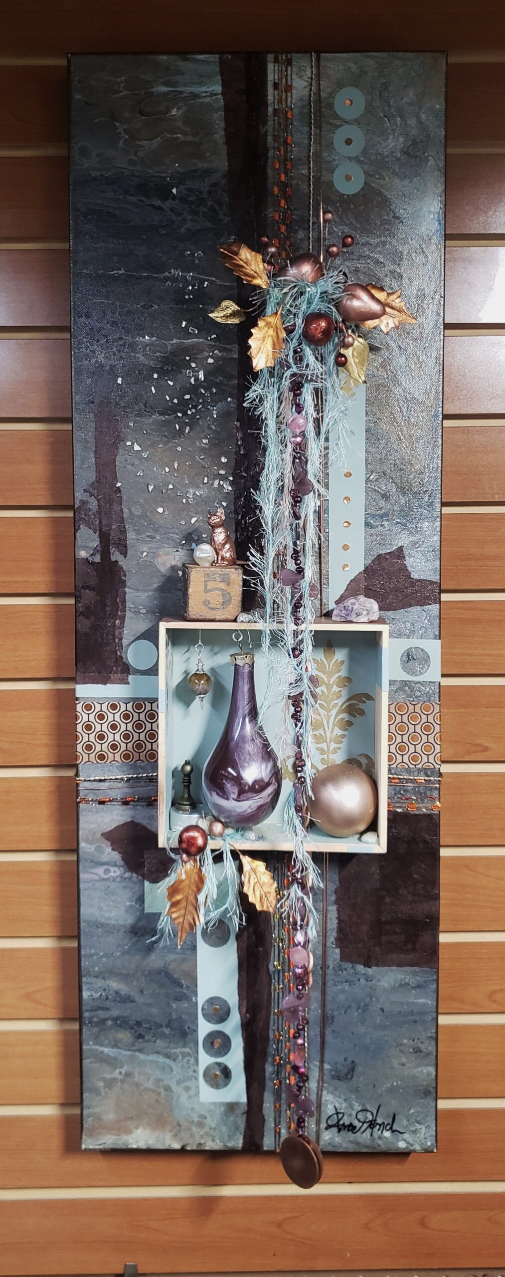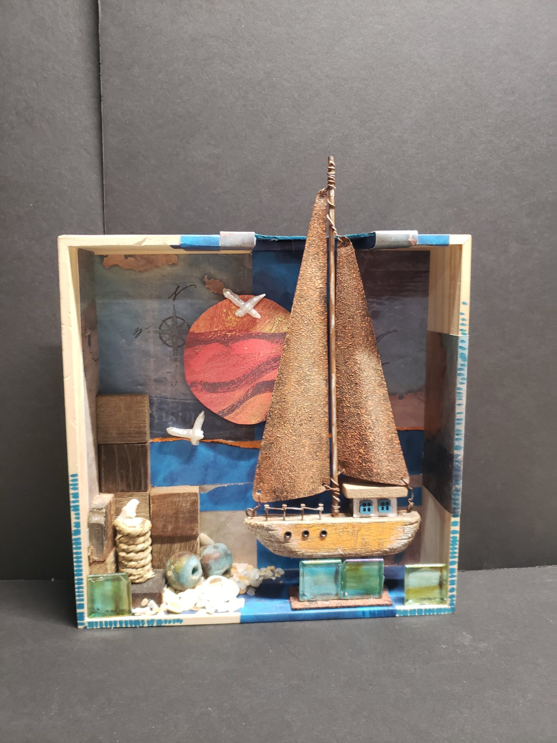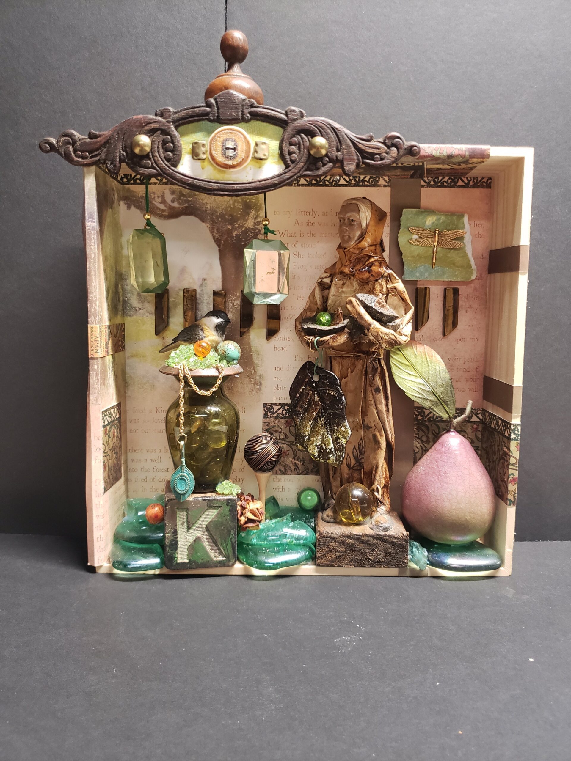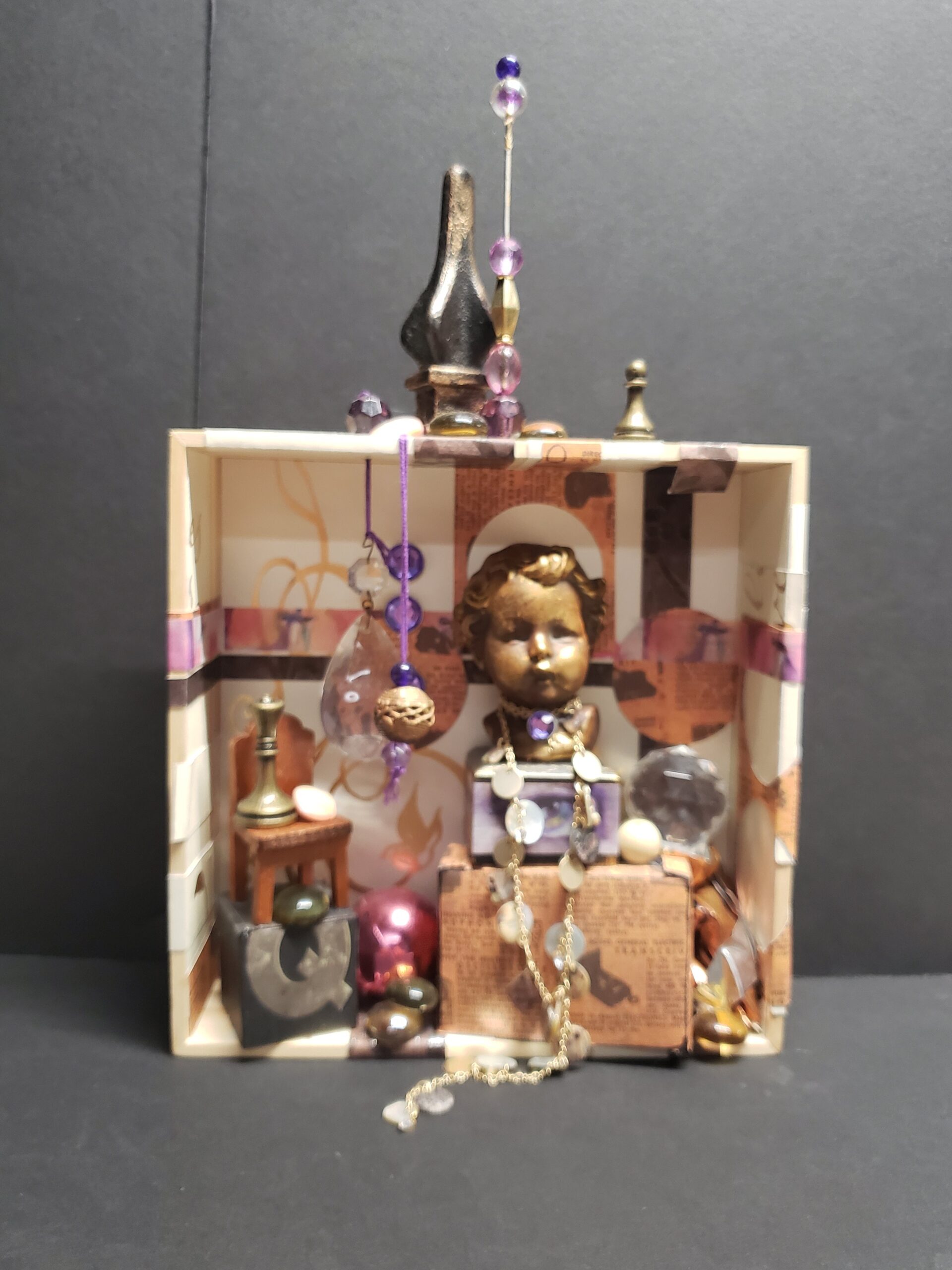 Do you remember creating dioramas in grade school? You know, the North American Native village scene with figures, teepees, fires animals, trees, etc. all in a shoebox on it’s side? Hence my inspiration for Curioboxity…boxes filled or built upon and adorned with a variety of curious, quirky and ordinary items. Some are created as a wall hanging, many can also be used a surface sitting art piece. All are one-of-a-kind using small antiques and collectables that I may never come across again.