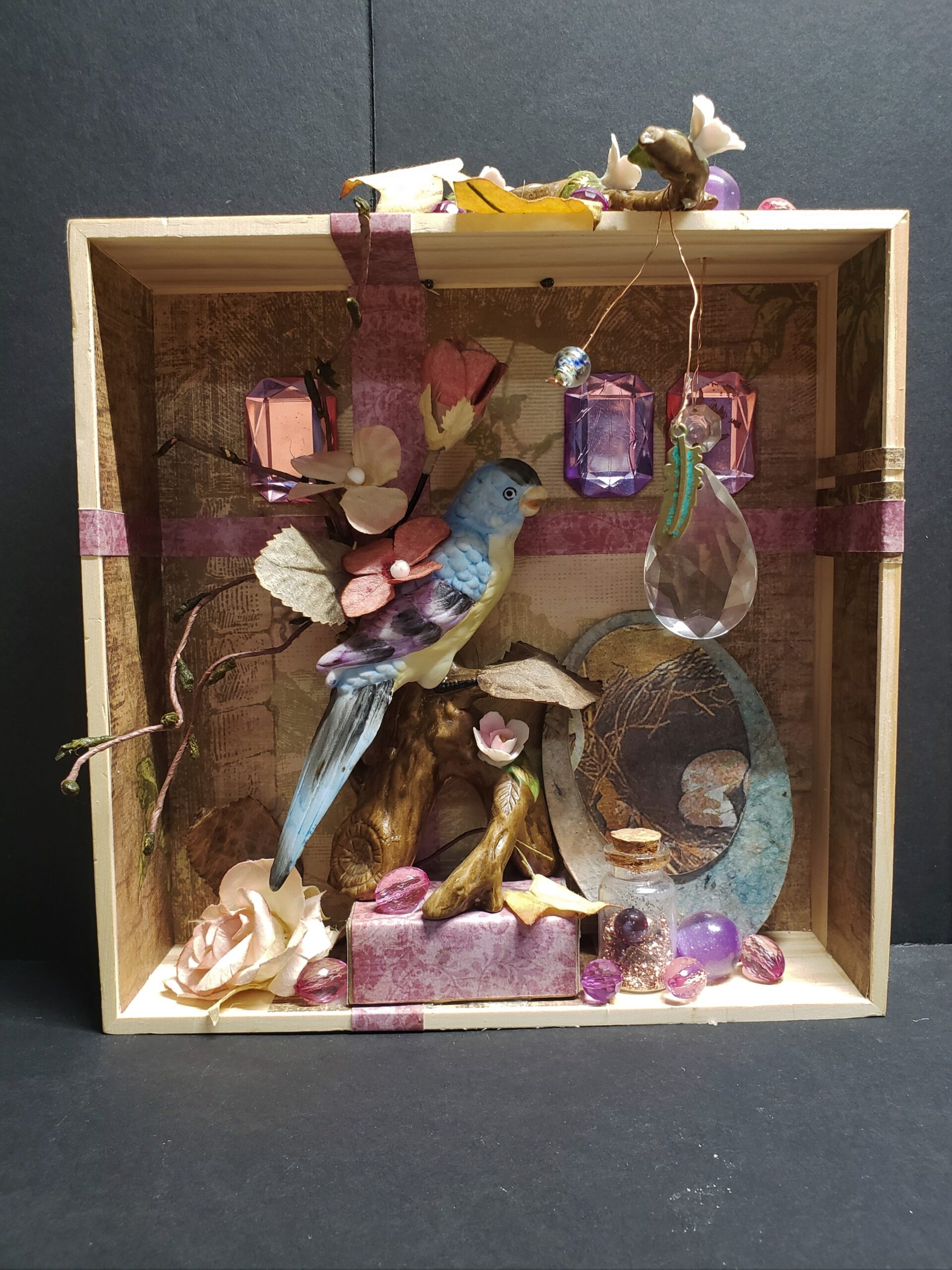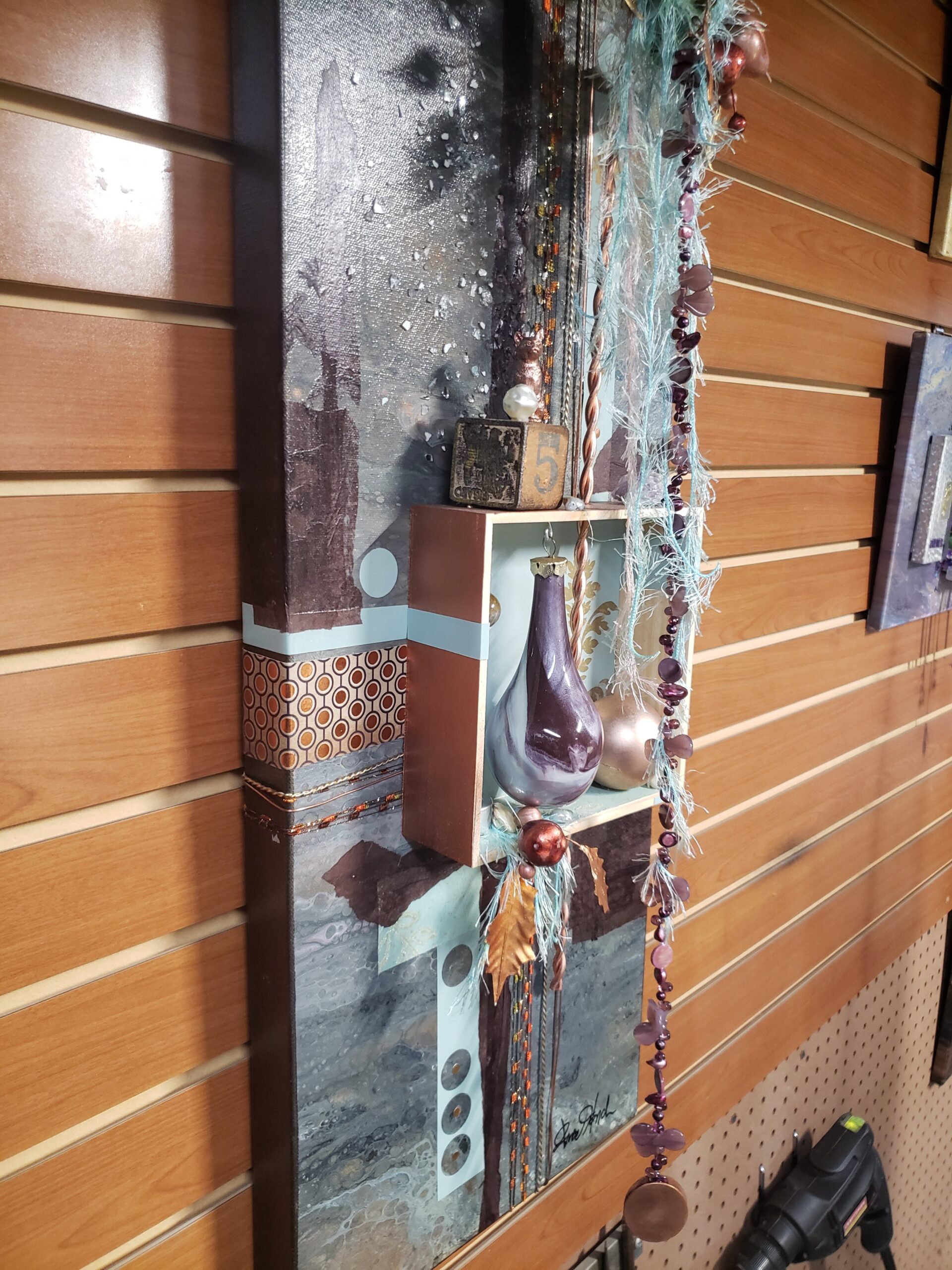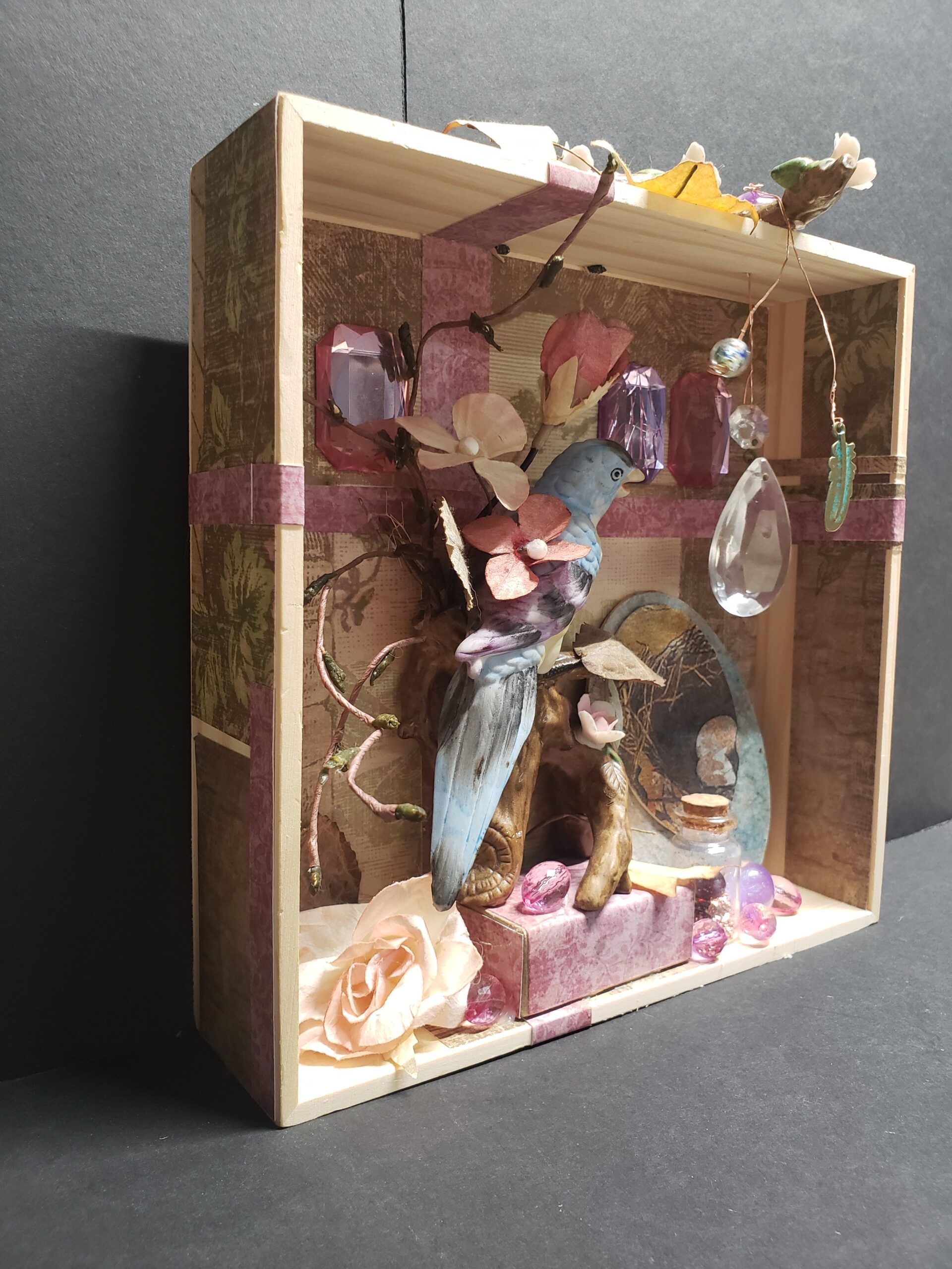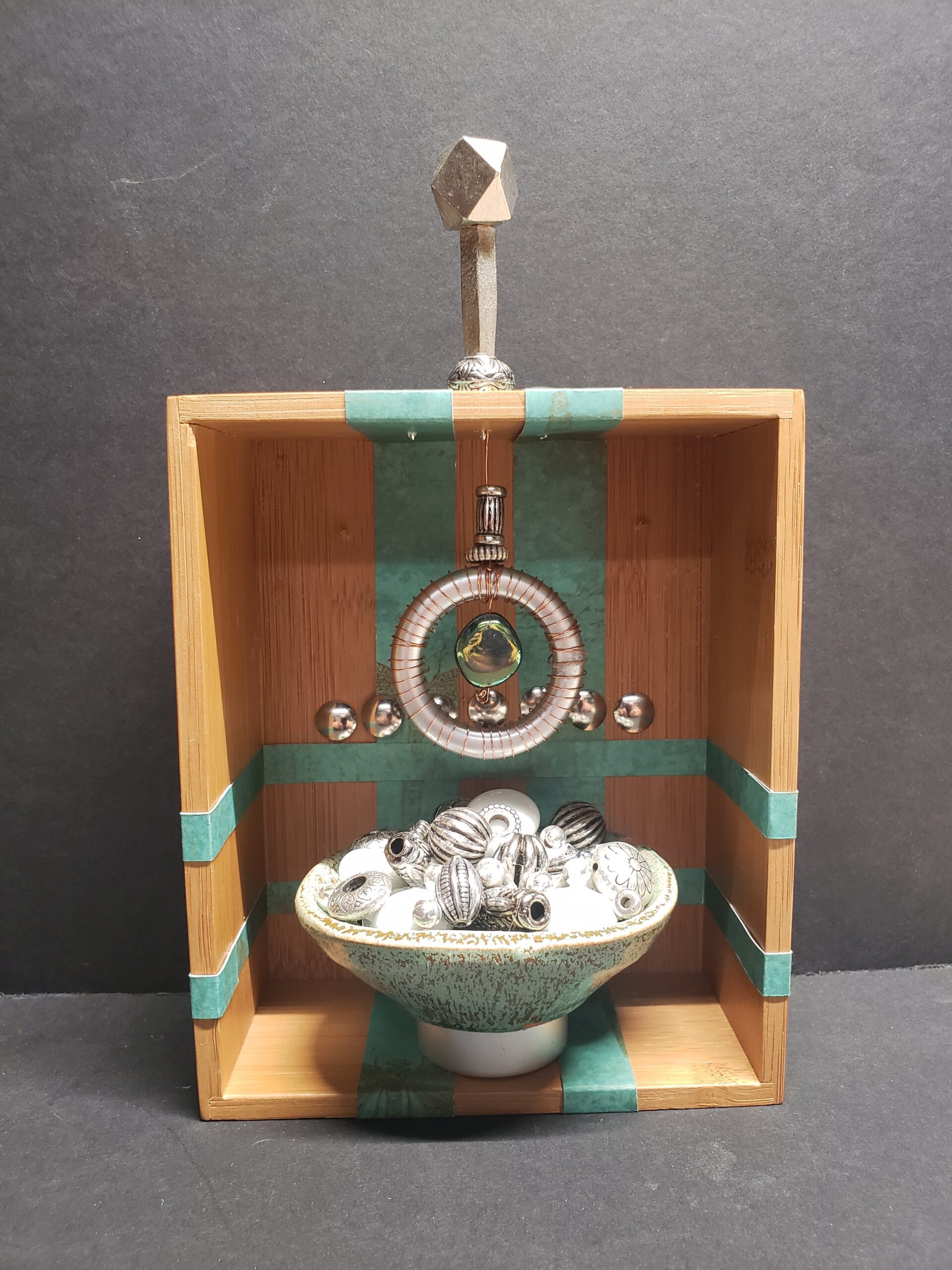 Do you remember creating dioramas in grade school? You know, the North American Native village scene with figures, teepees, fires animals, trees, etc. all in a shoebox on it’s side? Hence my inspiration for Curioboxity…boxes filled or built upon and adorned with a variety of curious, quirky and ordinary items. Some are created as a wall hanging, many can also be used a surface sitting art piece. All are one-of-a-kind using small antiques and collectables that I may never come across again.